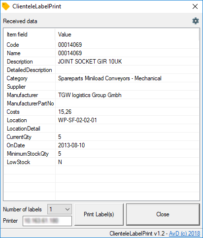 The XML file not only contains a query for each column the parameters from Clientle ITSM refer to but also as many label formats in Zebra ZPL code. When pressing the print button the data from the database is invoked in the ZPL code, saved as a temporary file and send to a Zebra printer by FTP.
